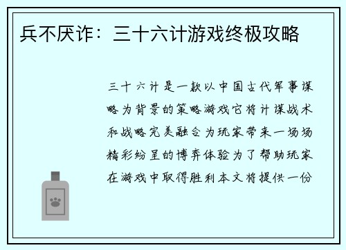 《三十六计》是一款以中国古代军事谋略为背景的策略游戏。它将计谋、战术和战略完美融合,为玩家带来一场场精彩纷呈的博弈体验。为了帮助玩家在游戏中取得胜利,本文将提供一份详细的游戏攻略,从多个方面进行阐述。...